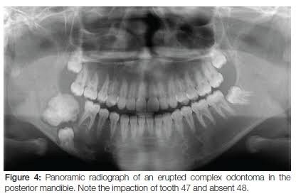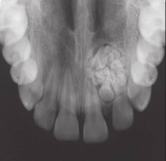 Radiographically, cluster of multiple tiny toothlike structure within a fine radiolucent rim.