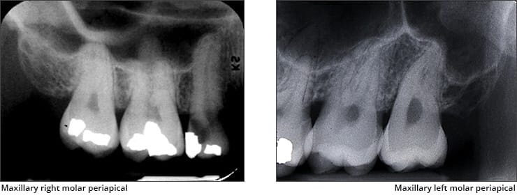 - Coronoid process – It appears as triangular radiopacity with its apex divided & in the region of the third molar. Narrow in lateral dimension. The coronoid process is the only mandibular structure recorded on maxillary molar periapicals.