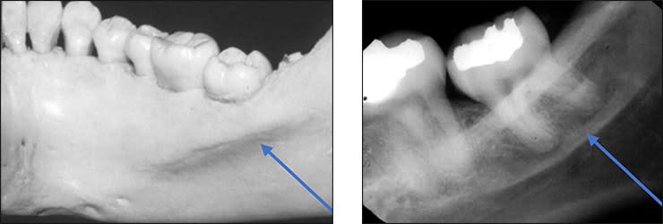 - External oblique ridge – The external oblique ridge or line is the bony anterior border of the ramus located on the outer aspect of the mandible. This ridge has a downward diagonal course. Radiopaque.