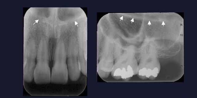 - Inferior concha – Appears as diffuse radiopaque mass within nasal cavity.