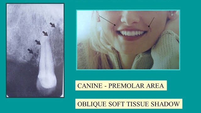 - Nasolabial fold – It is seen in periapical region of premolar. It is seen as oblique line demarcating the region that appears to be covered by a slight radiopacity.