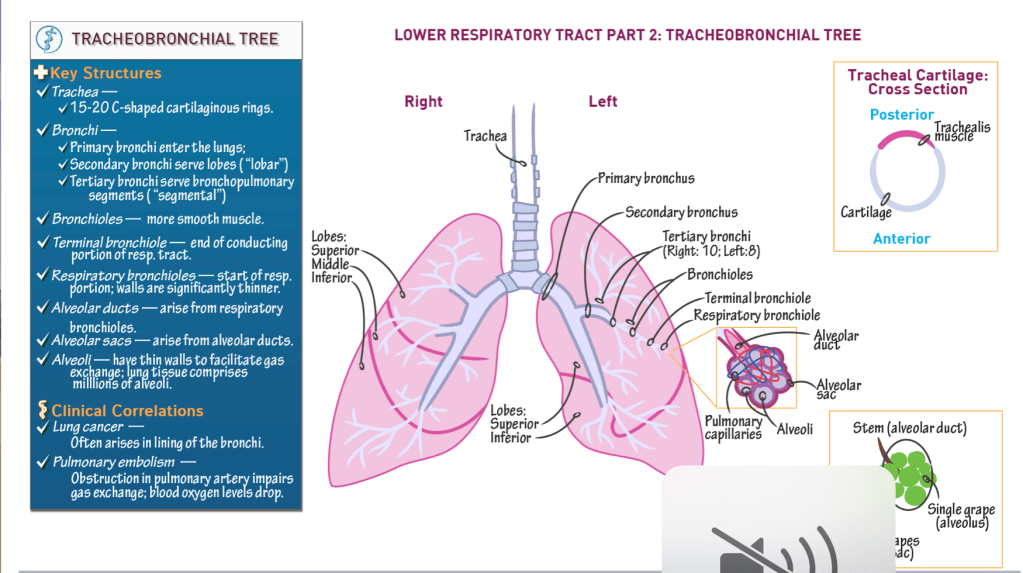 - Tertiary bronchi serve bronchopulmonary segments (“segmental” bronchi); 10 on the right, 8-10 on the left.