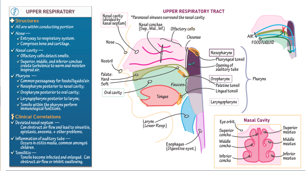 - Nasopharynx: posterior to the nasal cavity (and receives air from the nasal cavity).