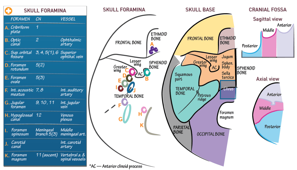 The skull foramina are the entry/exit sites of the cranial nerves through the skull base and the entry/exit sites of the major cranial vasculature through the skull base.