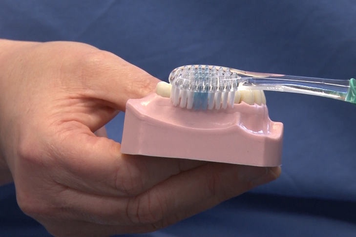 Tooth brushing techniques – this image shows the correct hold and toothbrush angle for the recommended BASS technique. © University of Sheffield