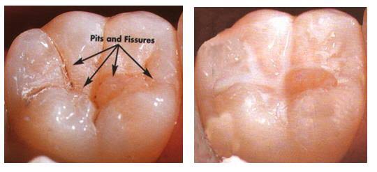 The sealant forms a smooth, protective barrier by covering all the little grooves and dips in the surface of the tooth. Dental decay easily starts in these grooves if they are not sealed.