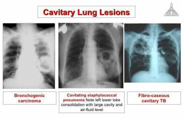 - Thin shaggy walled – Tuberculosis, Lung Abscess, Bronchogenic Carcinoma