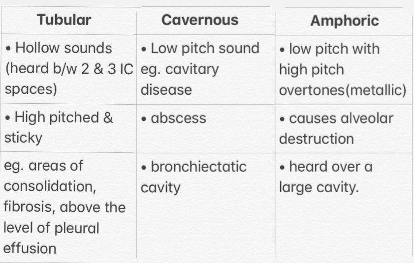➡️ The bronchial breath sounds over the trachea has a higher pitch, louder, Expiratory phase is longer than inspiratory phase and there is a pause between inspiration and expiration.