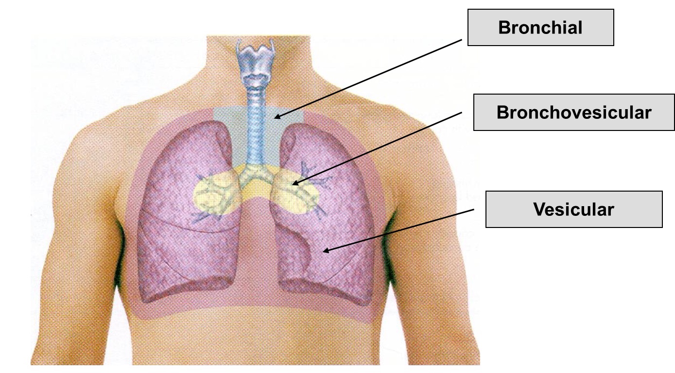 ➡️ The vesicular breathing is heard over the thorax, lower pitched and softer than bronchial breathing.