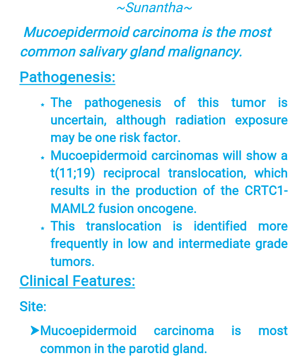 Oral Pathology MUCOEPIDERMOID CARCINOMA August 26, 2020 Dr.S.P.SunanthaLeave a comment SOURCE: Oral and Maxillofacial Pathology by Neville Share this:Tweet Share on Telegram (Opens in new window) Telegram Share on WhatsApp (Opens in new window) WhatsApp Email a link to a friend (Opens in new window) Email Like Loading... Related