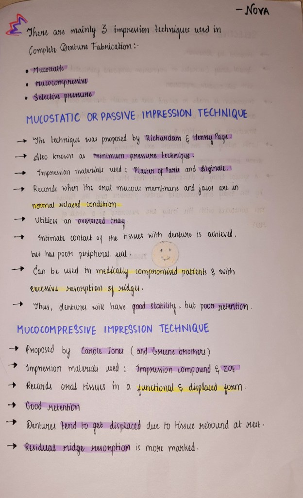 prosthodontics Impression techniques used in complete denture fabrication October 15, 2020 Poojitha SurgiLeave a comment SOURCE: MDS MERITERS Share this:Tweet Share on Telegram (Opens in new window) Telegram Share on WhatsApp (Opens in new window) WhatsApp Email a link to a friend (Opens in new window) Email Like Loading... Related