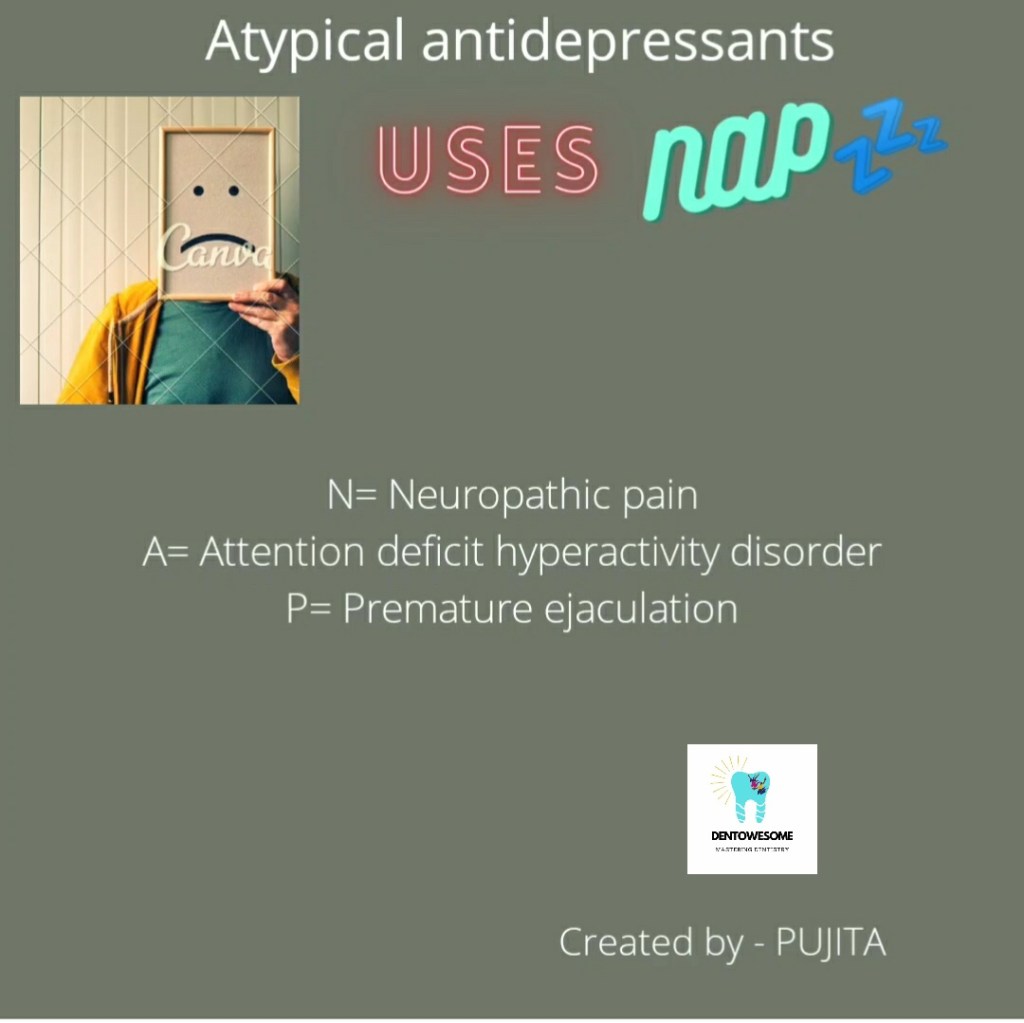 Mnemonic Mnemonic for Atypical Antidepressant Uses February 6, 2021 Anisha ValliLeave a comment Share this:Tweet Share on Telegram (Opens in new window) Telegram Share on WhatsApp (Opens in new window) WhatsApp Email a link to a friend (Opens in new window) Email Like Loading... Related