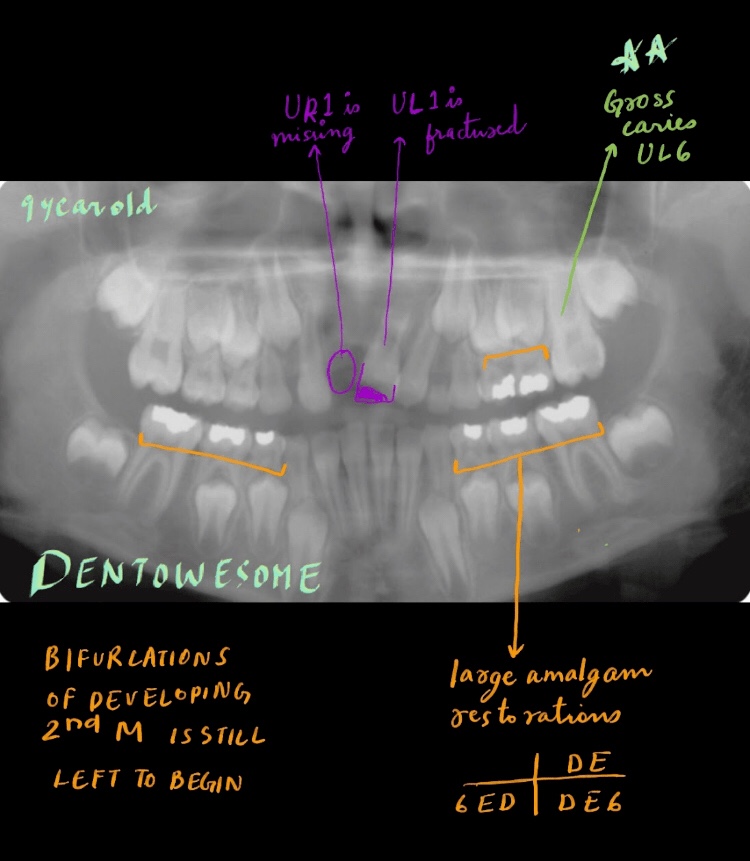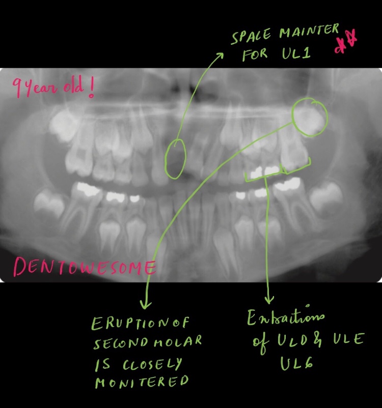 This child presented with significant pain in his upper left dental quadrant. He has an overjet of 8mm, a mild skeletal class II pattern and average vertical proportions, and is still sucking his thumb.