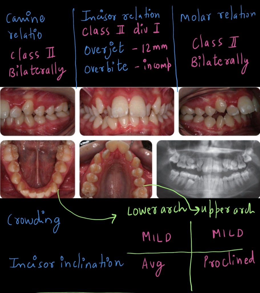 A 12-year-old female presented with a class II division 1 malocclusion on a moderate skeletal class II pattern, with increased vertical dimensions complicated by an increased overjet (12mm), crowding of both dental arches and teasing in relation to her dento-facial appearance.