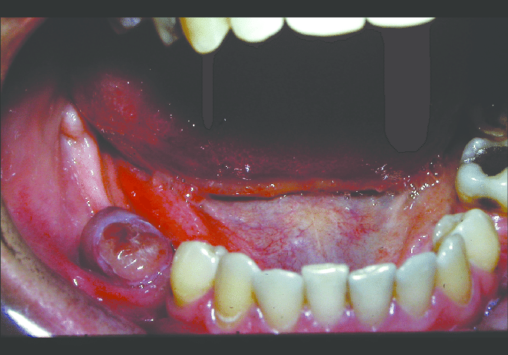 A 58-year-old man presented with a brown–red granular epulis. A periapical radiograph showed underlying bone destruction and a biopsy was reported as showing osteoclast-like giant cells in a spindle-cell background with numerous thin- walled vessels. Haemosiderin and extravasated red cells were abundant.