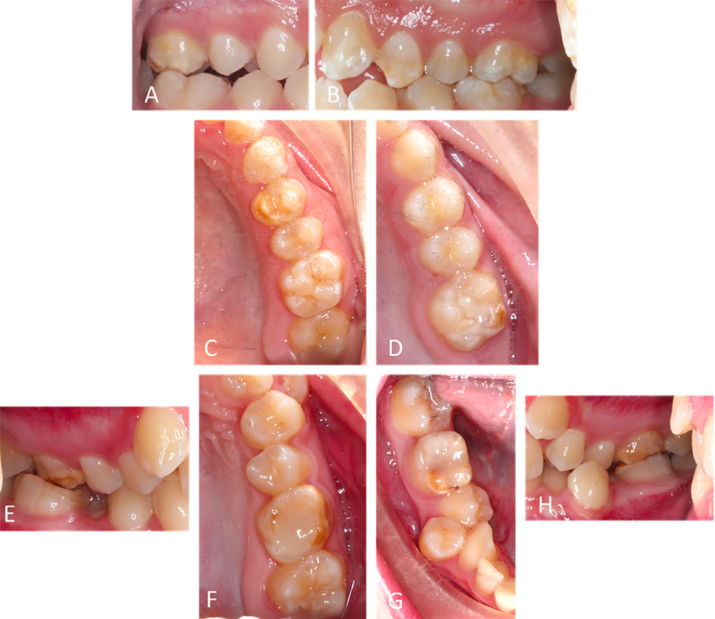 (A and B) Demarcated opacities (hypoplasia) in enamel of molars. (C and D) Opacities on the occlusal surface and posteruptive breakdown of molars. (E to H) Atypical composite restoration involving the occlusal restorations in molars.
