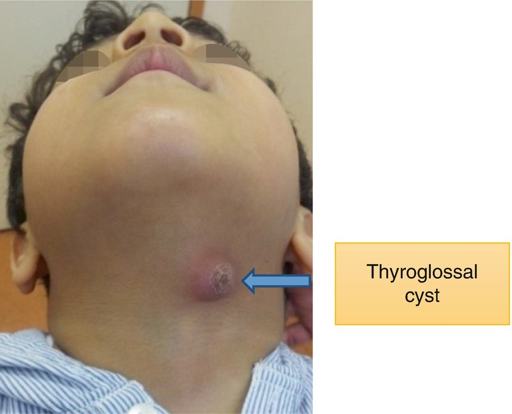 A thyroglossal cyst is a fibrous cyst that forms from a persistent thyroglossal duct. Thyroglossal cysts can be defined as an irregular neck mass or a lump which develops from cells and tissues left over after the formation of the thyroid gland during developmental stages