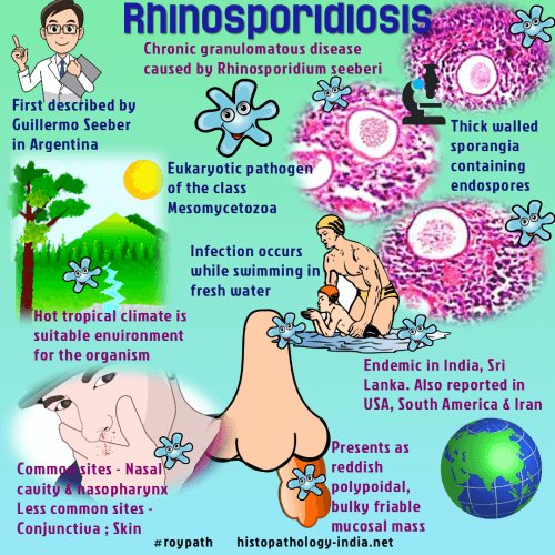 (i) Rhinosporidiosis is a chronic granulomatous disease characterised by formation of friable polyps, usually confined to the nose, mouth or eye.