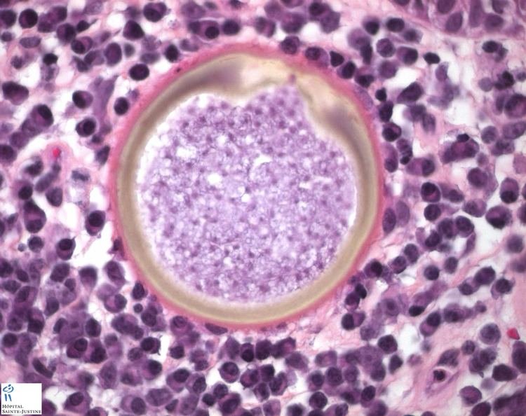 •Tissue sections stained with H & E stain show large number of endospores within the sporangia embedded in a stroma of connective tissue and capillaries.