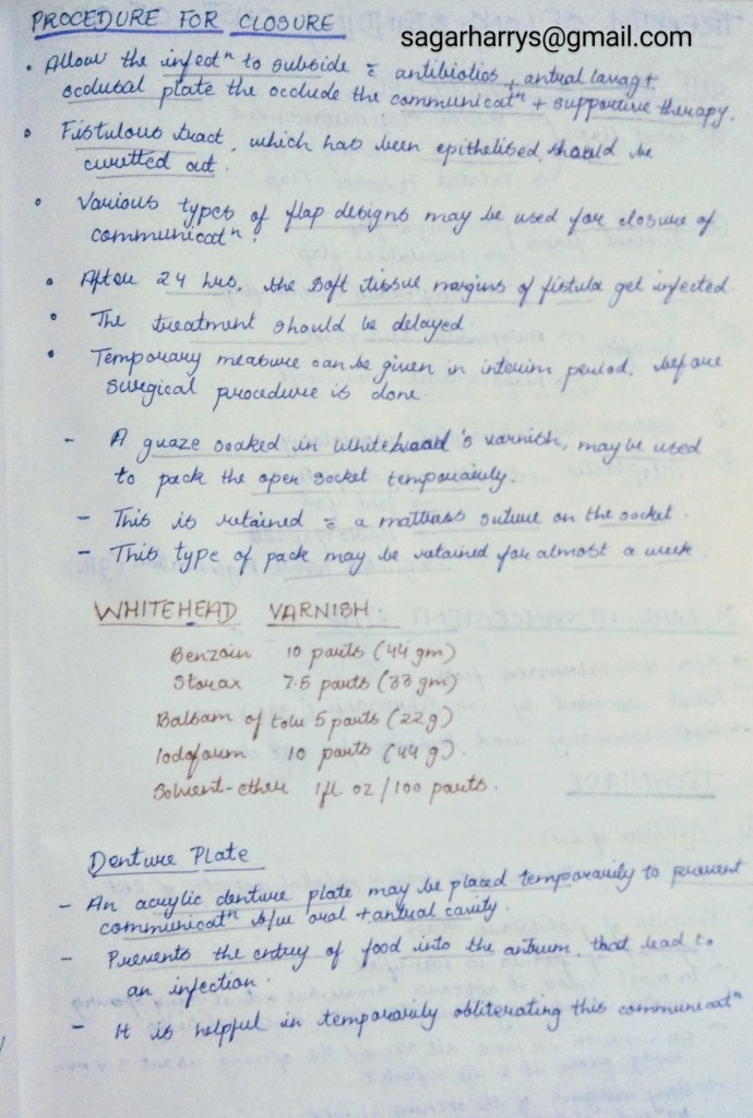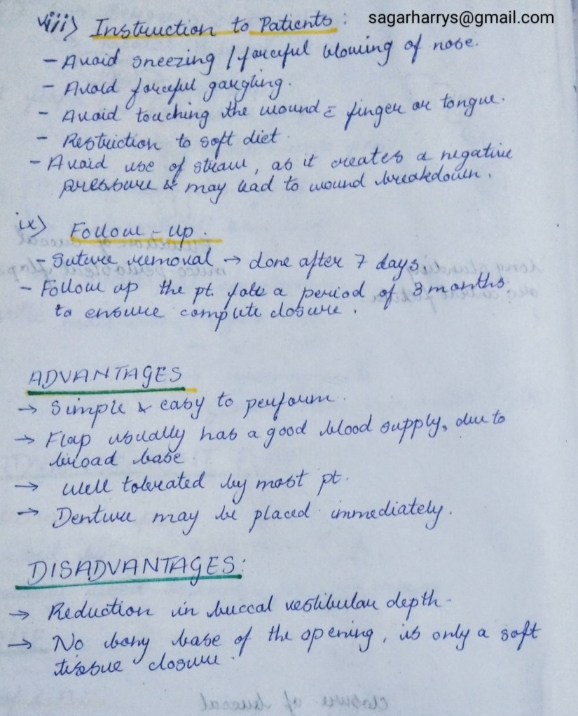• It is posteriorly based flap which gets its supply from the greater palatine artery. • Local anesthesia is infiltrated on the palatal aspect. Infilteration is also given on the buccal side of the oroantral defect. • Removal of fistula tract and clearing any signs pathology. • The flap is outlined with surgical marking an excess of what appears to be required to rotate the flap. • Incision is placed to the bone making sure the palatal pedicle is kept intact. • A full thickness mucoperiosteal flap is reflected with care taken to visualize the greater palatine vessels. • A small amount of tissue along the margin of the defect on the buccal aspect is also reflected to enable suturing. • The flap is reflected and rotated to fit the defect. There are chances of ending of the tissue when it is turned to cover the oroantral opening. • The flap is sutured to the buccal flap ensuring a good water tight seal. • The raw surface of the palate is left to granulate only. • A small gauze soaked in Whitehead’s varnish may be placed on that raw surface for a few days.