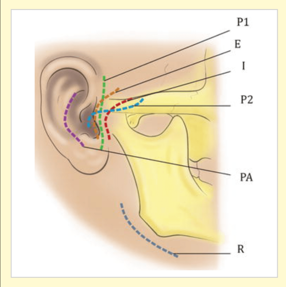 SURGICAL APPROACHES TO THE TMJ: P1 and P2— preauricular approaches; PA-postauricular approach; I—inverted hockey stick approach; E -endaural approach. R-retromandibular approach.