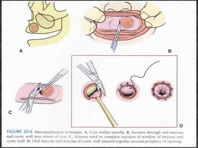1) Anaesthesia 2) Aspiration 3) Incision: Circular, oval or elliptical. Inverted U Shaped incision with broad base the buccal sulcus. Mucoperiosteum is reflected in this case. 4) Removal of bone 5) Removal of cystic lining specimen 6) Visual examination of residual cystic lining 7) Irrigation 8) Suturing of cystic cavity. • Cystic lining sutured with the edge of oral mucosa. • In Y Shaped incision the mucoperiosteal flap can be turned into cystic cavity covering the margin. • The remaining is sutured to oral mucosa.