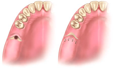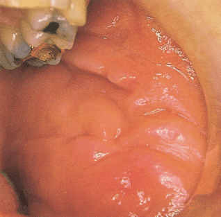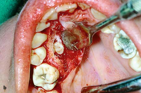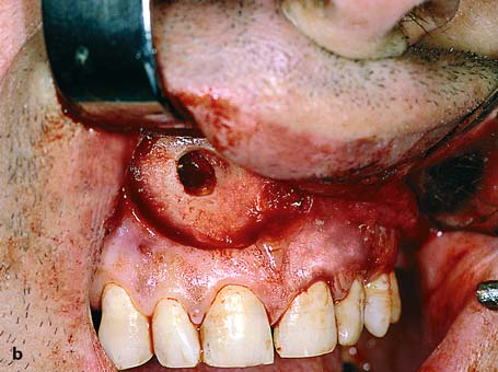Palatal Flap. This type of flap is used in edentulous patients so that the vestibular depth is maintained. The resulting palatal mucoperiosteal flap is rotated posteriorly and buccally, always including the vessels that emerge from the corresponding greater palatine foramen. After rotation, the flap is placed over the orifice of the socket, the wound margins are debrided, and the flap is sutured with the buccal tissues. A gingival dressing is applied for a few days at the void created and healing is achieved by secondary intention.