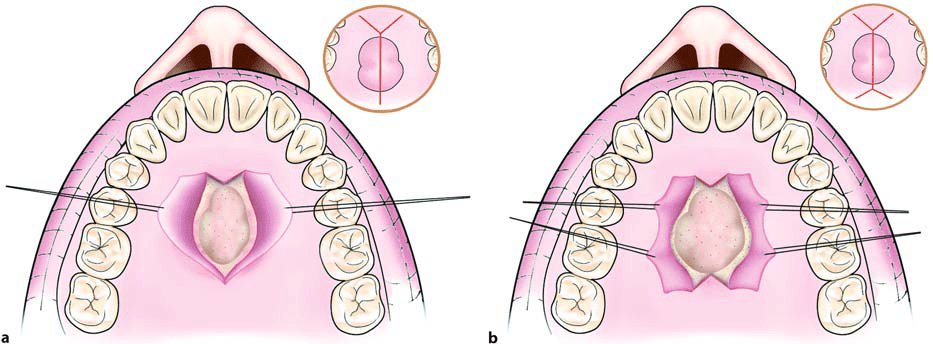Flap Resulting from Y-shaped Incision.An incision is made along the midline of the palate, as well as two anterolateral incisions, which are anterior to the canines. This type of flap is indicated in surgical procedures involving the removal of small exostoses.
