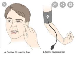 Chvostek’s sign-contraction of facial muscles on tapping over facial nerve branches.