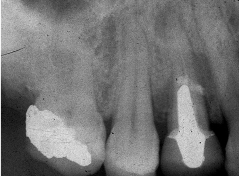 The radiograph shows a large restoration in the molar and a post crown on the first premolar. In the premolar, the root filling looks insubstantial and there is a periapical granuloma present. At the level of the end of the post, there is radio-opaque material overlying the tooth and bone. Also at this level and further coronally, lamina dura is lost along the root surface.