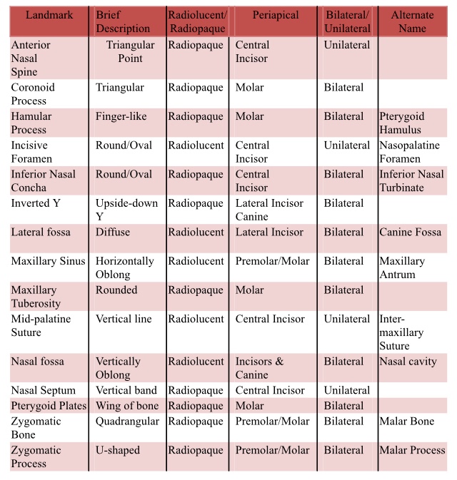 Summary of Maxillary Radiographic Landmarks