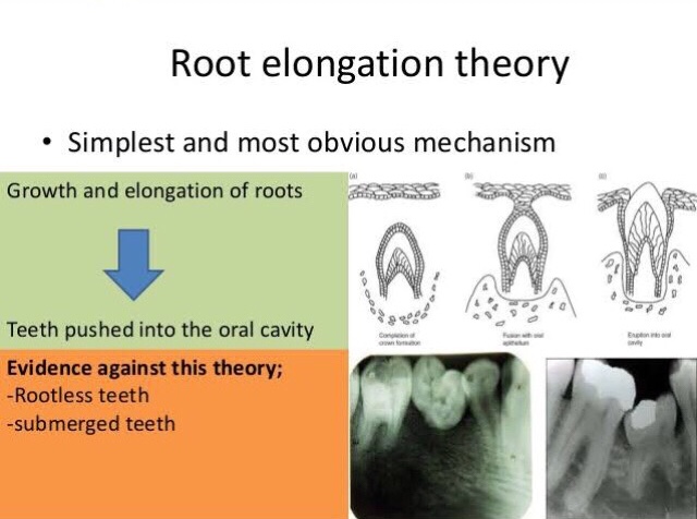 b. Root growth: According to the proponents of this theory, the apical growth of root results in an axially directed force that brings about the eruption of the teeth. This theory has not been accepted. Teeth move a greater distance during eruption than the increase in root length. In addition the onset of root growth and eruption do not seem to coincide. Teeth that are malformed and lack roots also erupt in a no. of cases.