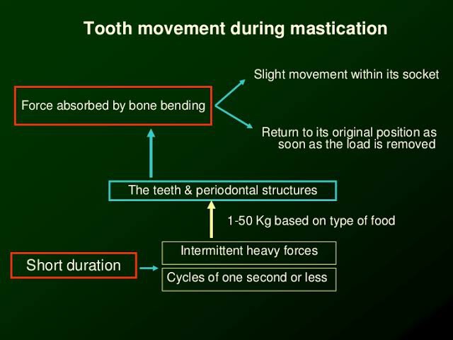 ➡️ During mastication, the teeth and periodontal structures are subjected to intermittent heavy forces, which occur occur in cycles of one second or less and may range from 1-50 kg based on the type of food being masticated. A tooth subjected to these heavy forces, exhibits slight movement within its socket and subsequently returns to its original position as soon as the load is removed.
