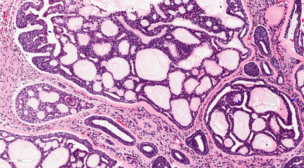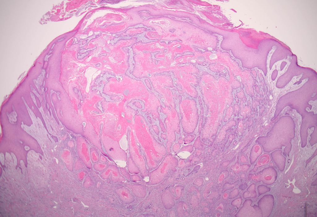 A cyst was removed along with an unerupted third molar tooth. The pathologist reported a fibrous capsule that was myxoid in places and that was lined by a thin layer of squamous and cuboidal epithelium. The cyst originated from the amelocemental junction.