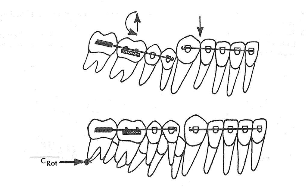 - Buccal segments rotate with mesial root movement (flattening curve of Spee)