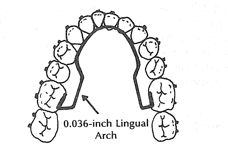 | Lingual arch | 0.036-inch wire to stabilize molars and maintain transverse control |
