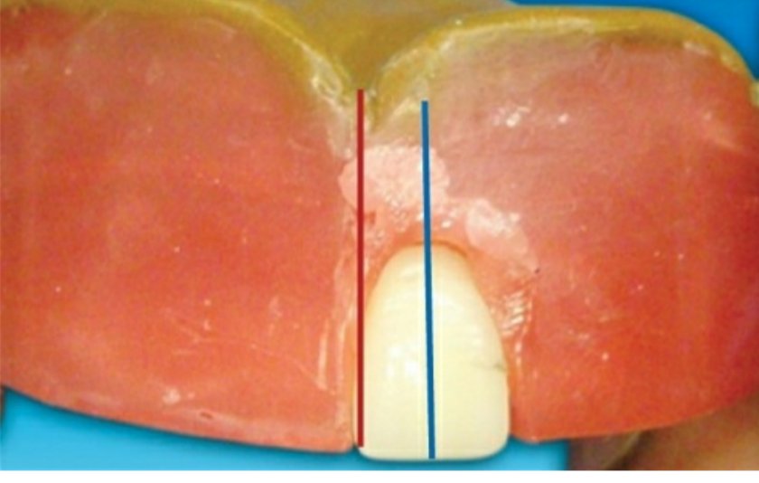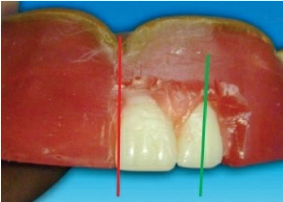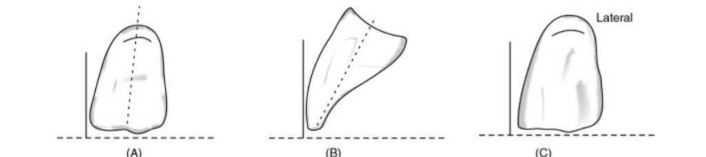 🔻The long axis of the lateral incisor (green line) is placed slightly inclined to
