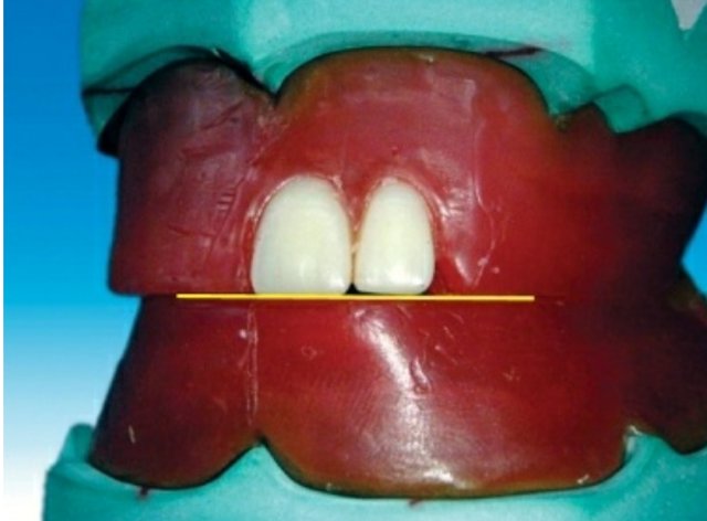 of the occlusal rim, and the incisal edge of the mandibular central incisor tooth