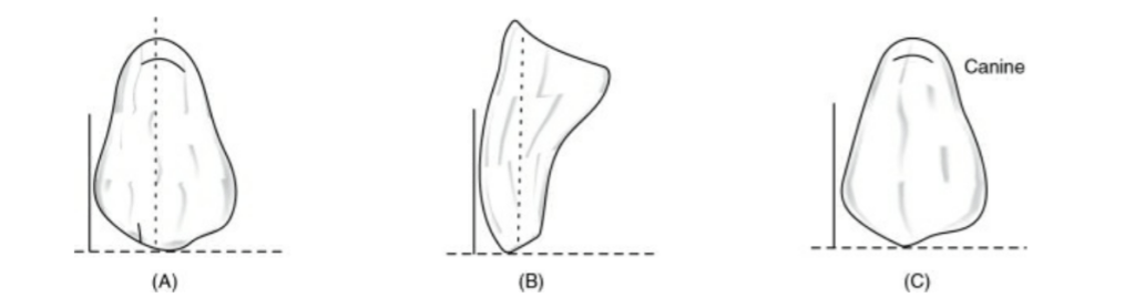Occlusal plane: Cuspid tip is in contact with occlusal plane