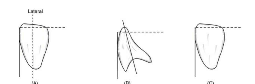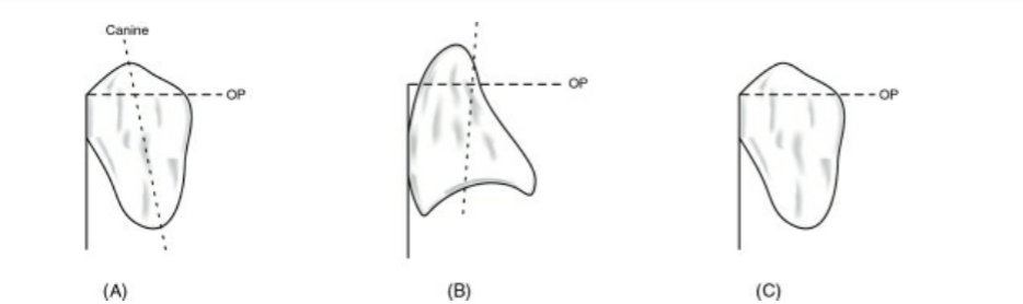 🔻The long axis of the maxillary canine (yellow line) should be parallel to the