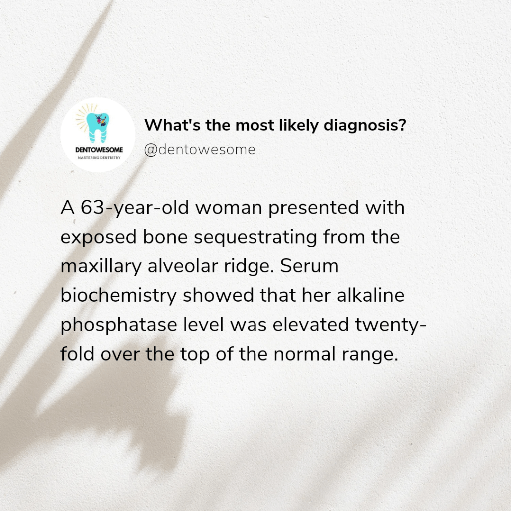 Highly elevated alkaline phosphatase is a good marker of Paget’s disease of bone in the appropriate clinical setting. Bone sequestration is often secondary to chronic osteomyelitis in the jaws. Bisphosphonates are used to treat Paget’s disease and also have been linked to jaw osteonecrosis.