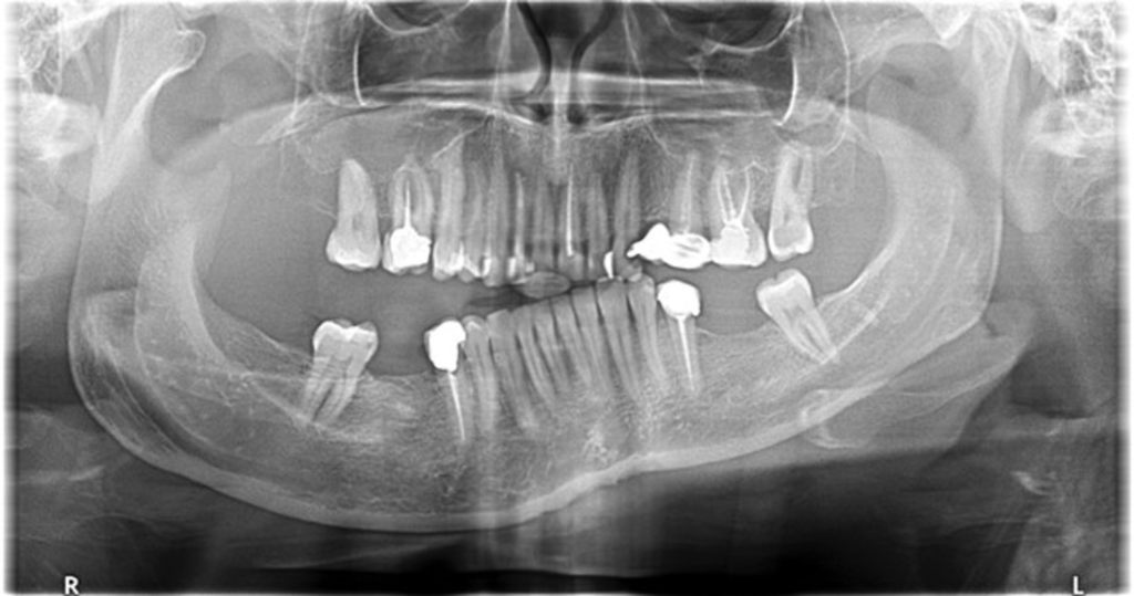 A 28-year-old woman presented for a check-up. The dentist noticed that the occlusal plane was depressed on the left side. The molar teeth did not make contact with the maxillary teeth on that side, though wear facets were present.