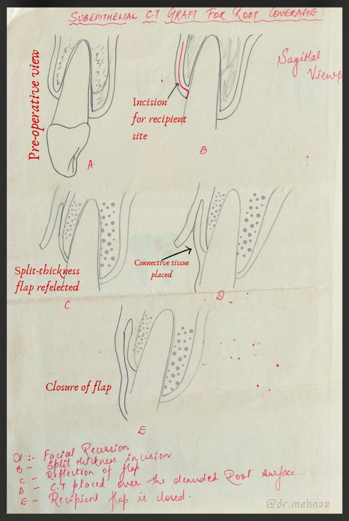 Adjacent to the denuded root surface, the donor connective tissue is sandwiched between the split flap as shown in the figure.
