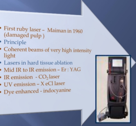 .Er:Cr:YSGG(2780 nm)- Erbium,Chromium,Yttrium,Scandium,Gallium,Garnet laser – works by agonizing water droplets as they travel towards the target tissue.