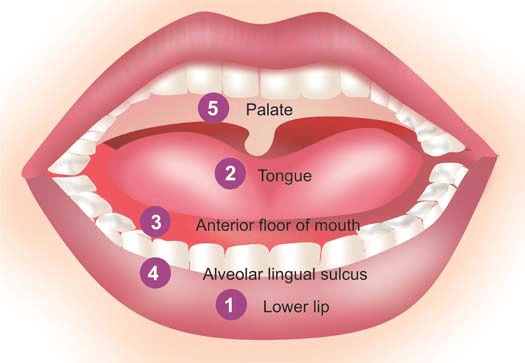 -These sites, in descending order of frequency, are: the lips (more commonly lower), tongue, anterior floor of mouth, buccal mucosa in the region of alveolar lingual sulcus, and palate.