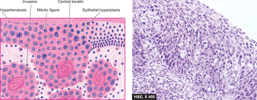SCC is defined as ‘a malignant epithelial neoplasm exhibiting squamous differentiation as characterized by the formation of keratin and/ or the presence of intercellular bridges‘.